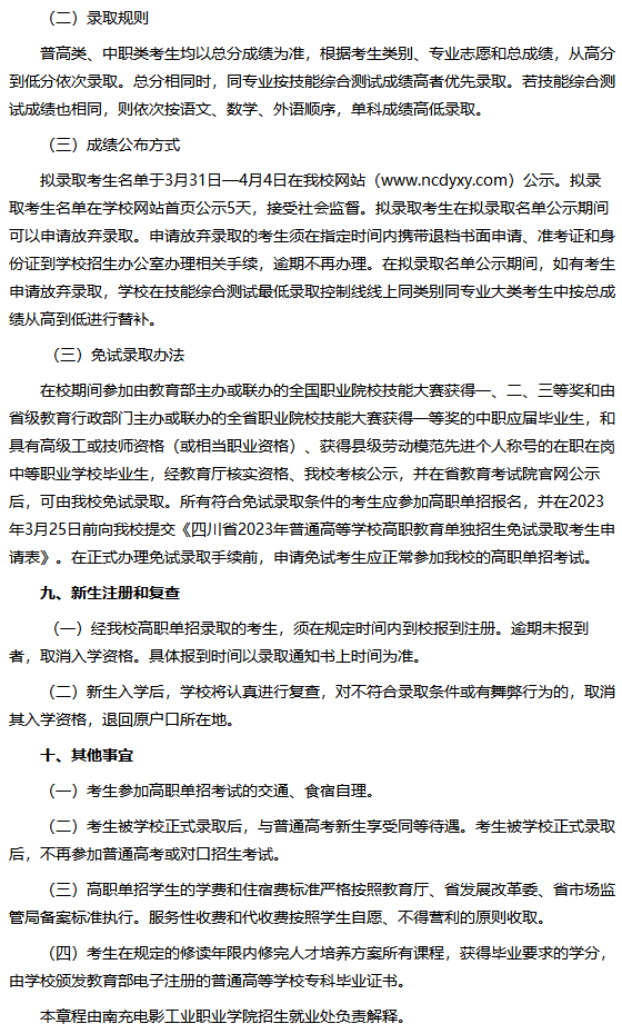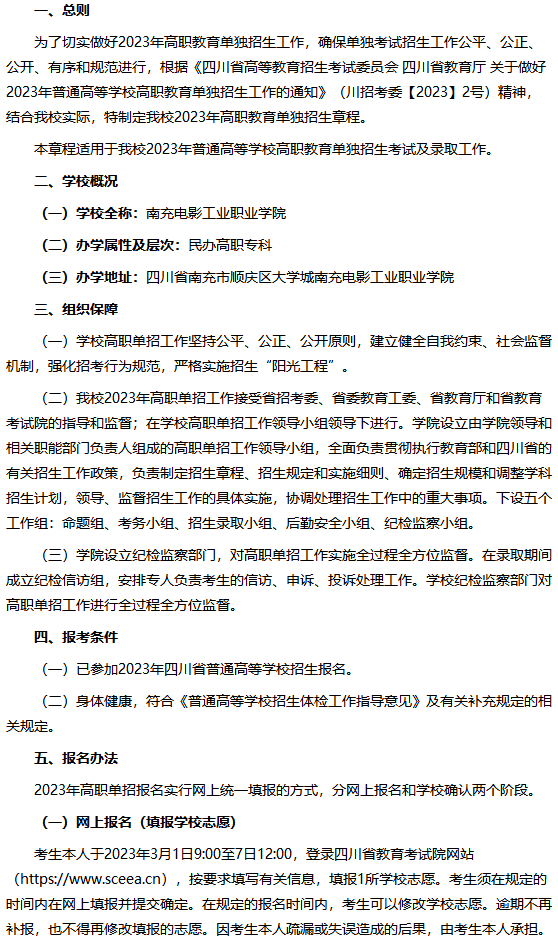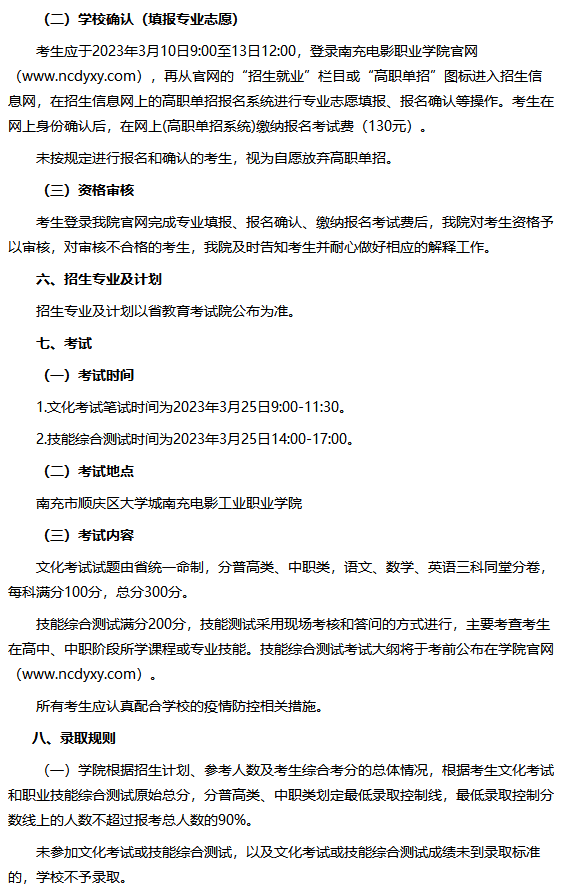 南充电影工业职业学院2023年高职教育单独招生章程